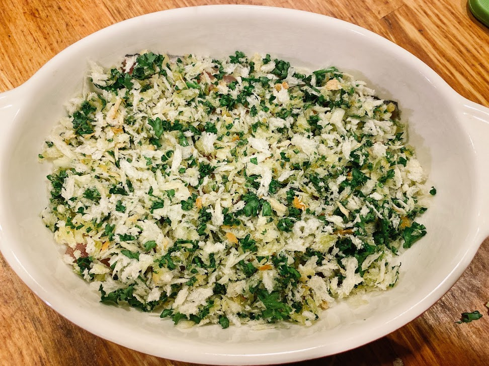 ②パセリとにんにくをみじん切りにしてパン粉とオリーブオイルを混ぜておく。