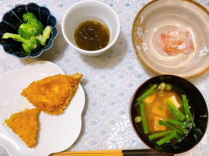 刺身を中心に野菜で構成。小松菜はさっと湯通ししておき、にんにくのみじん切りを油大さじ1で炒め、中華スープ1と塩適宜を加える。コクをだすにはカリカリに焼いた細切りベーコンも加える。そのほか、ジーマーミ豆腐、魚焼きコンロでカリカリに焼いた揚げ豆腐に大根おろし添え、なめこ椀。