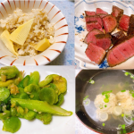 2021年3月21日 / 最終更新日時 : 2021年5月8日 wpmaster 和食 2021年3月20日(筍ご飯、鰯のつみれ汁、蚕豆とアスパラの中華炒め、ヒレステーキ) 京都産の白い筍を4本もいただいたので、さっそく茹でて筍ご飯に。鯵の刺身(たたき)を活用してつみれ汁に、メインはヒレとランプのステーキ、季節の野菜は中華風塩炒めで。 筍は1本(約170g)、油揚げ1枚のみじん切り、だしで炊 […]