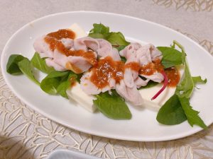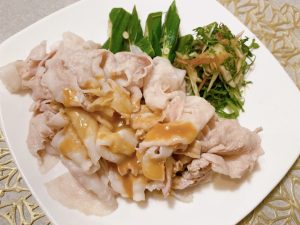 ②豚肉を一口大に切り、ネギ(ぶつ切り)、玉ねぎ(薄切り)を①で和えて10分ほど置く。