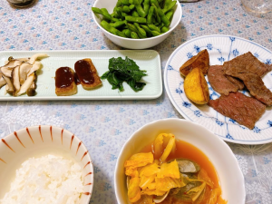 ②表面を拭き取り、フライパンに温めた(A)の煮汁に入れて弱火から中火で10分煮る。途中、裏返したり、煮汁をかけたりしながら、まんべんなく火が通るようにする。